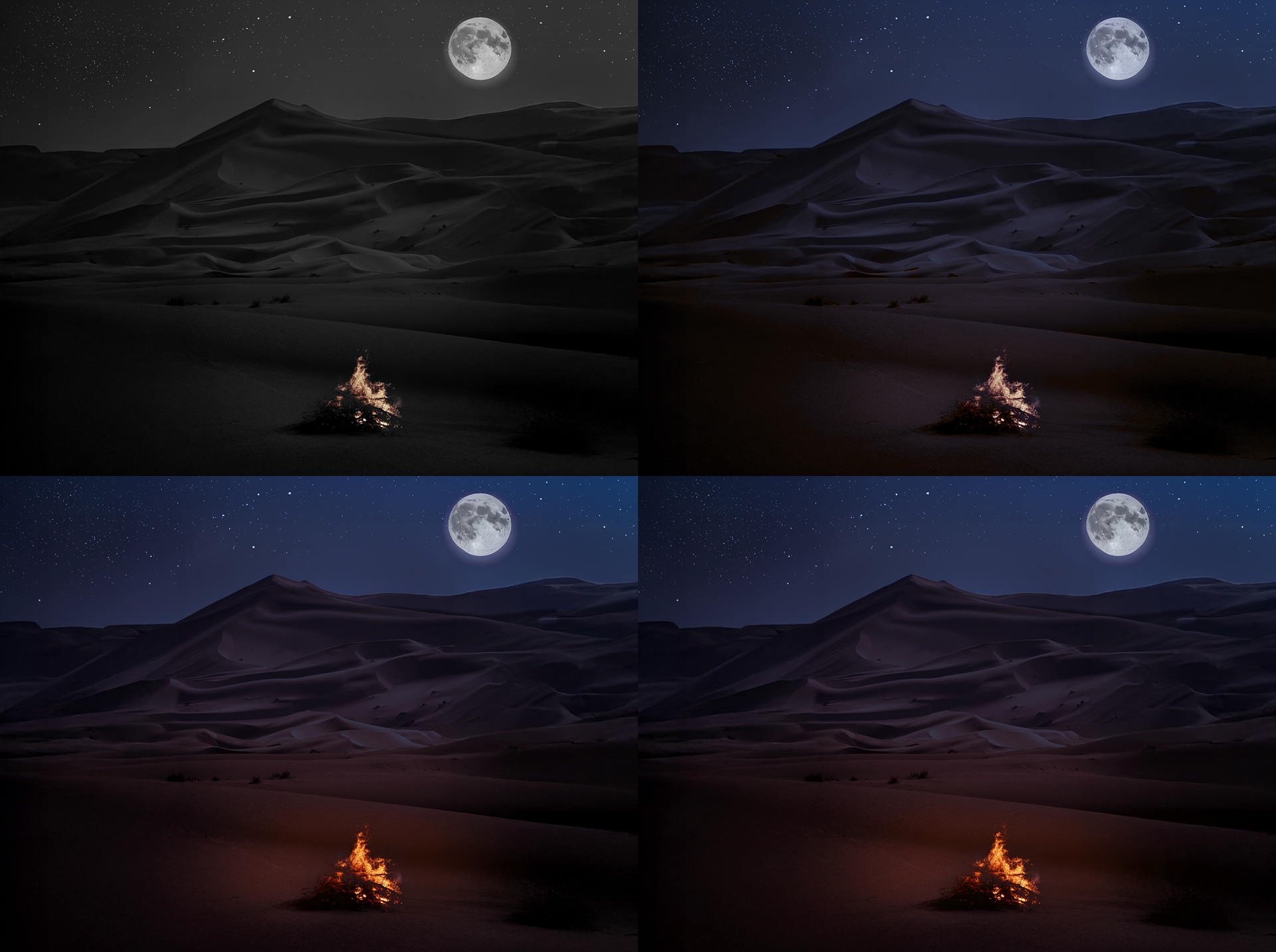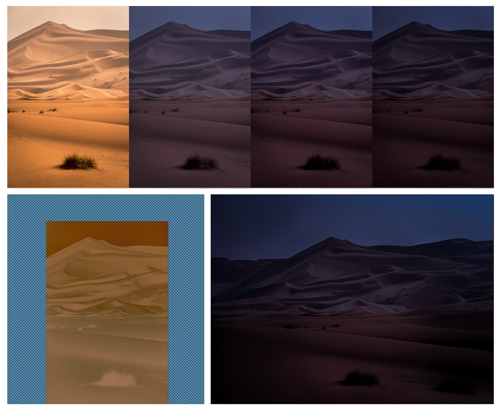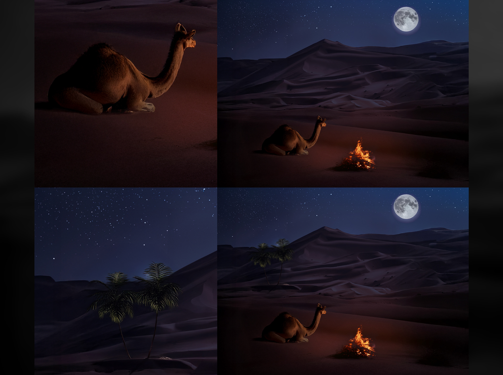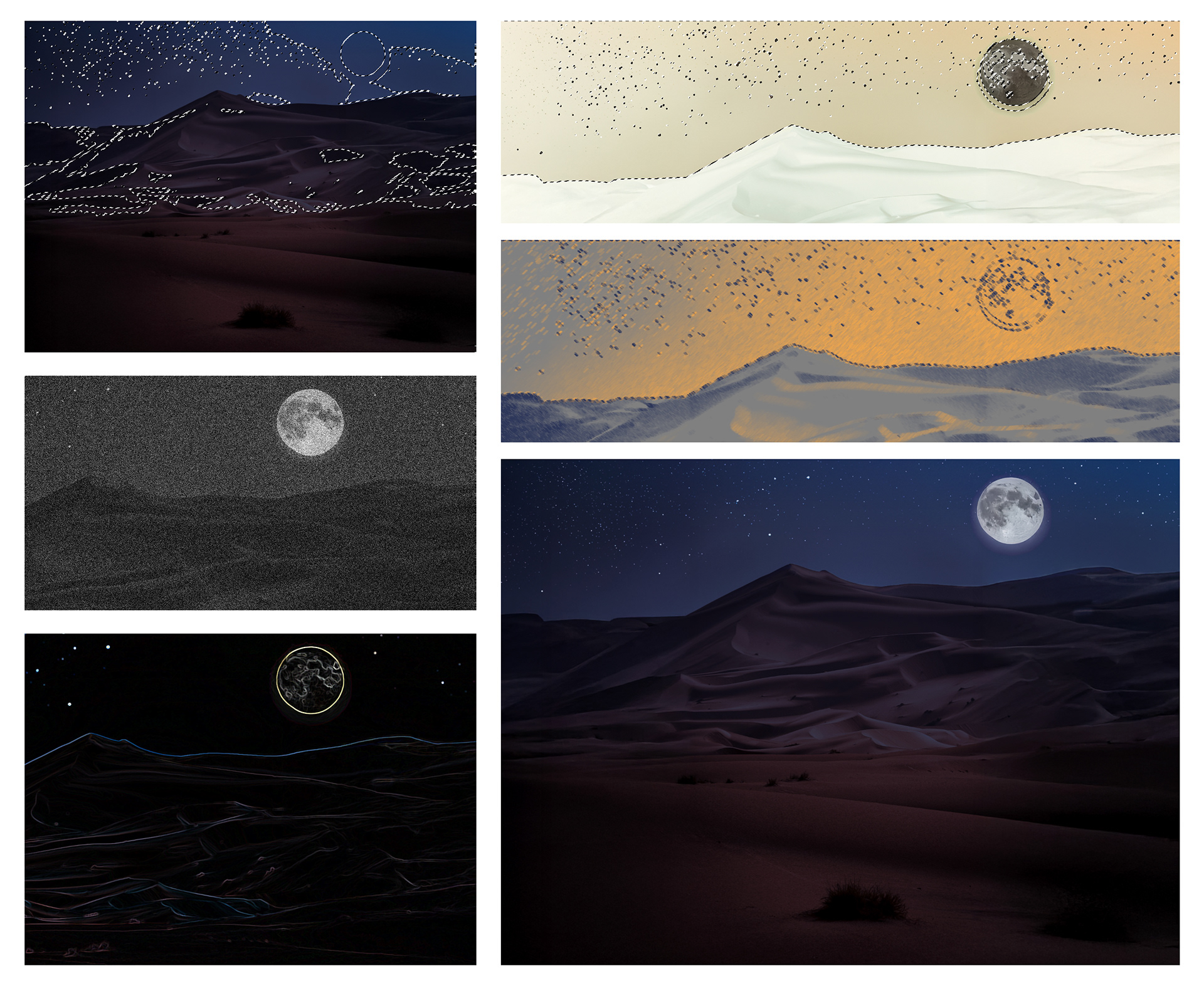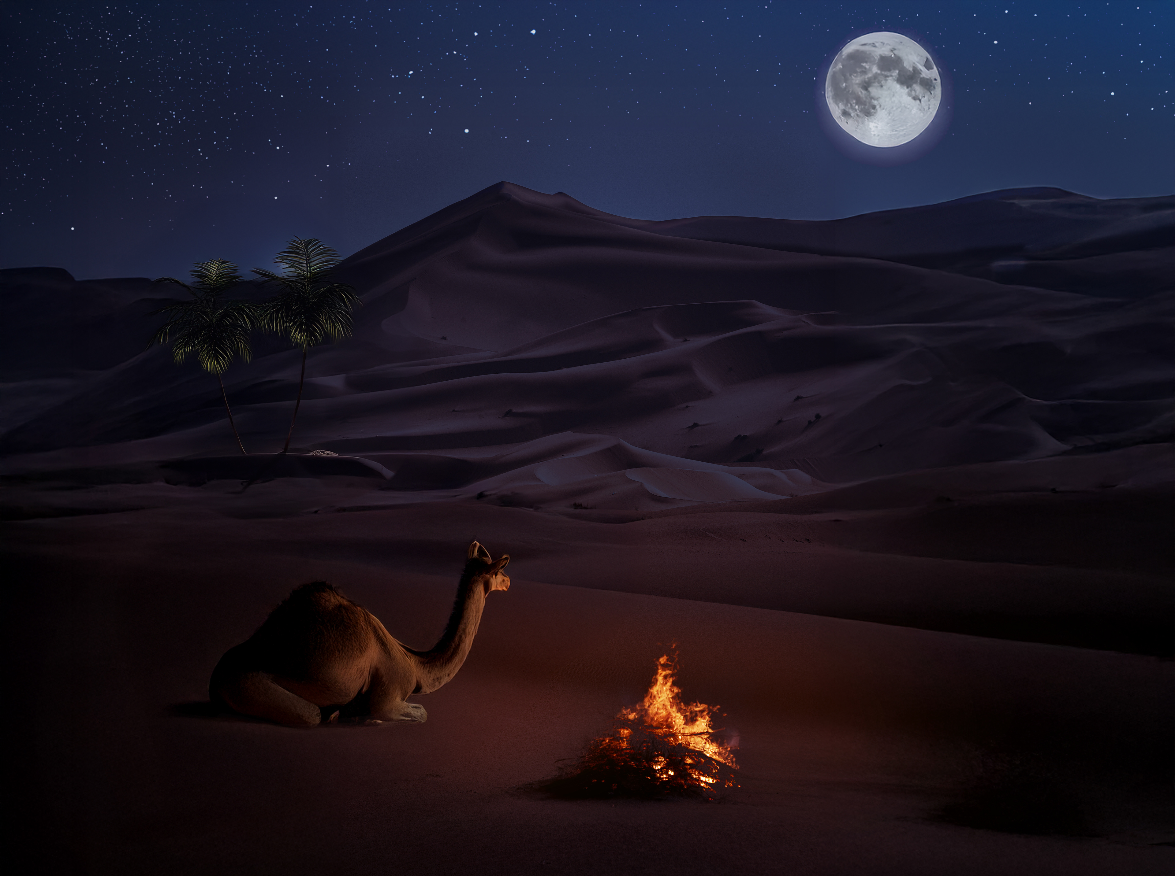 Designed by Amar Morsy | This graphic design was created using Adobe Photoshop and captures the quiet mystery of a desert night. The original image was a small and narrow scene taken during the day, which was completely transformed into a moonlit landscape through advanced editing techniques. AI tools were used to seamlessly blend various visual elements, including the addition of a camel and a palm tree to emphasize the desert theme. Subtle details—such as distant dunes, glowing stars, and ambient lighting—were incorporated to expand the sense of space and tranquility under a night sky. Several parts of the image, like the sky and environmental features, were generated or enhanced using AI to enrich the atmosphere. Color grading played a key role in the transformation. The warm daylight tones were replaced with deep blues and purples to simulate nighttime, creating a calm and dreamy mood. Shadows were deepened and highlights were carefully adjusted to reflect moonlight rather than sunlight. The final result is an immersive digital artwork that blends creative vision with modern AI tools, turning a simple scene into a dreamy desert night.